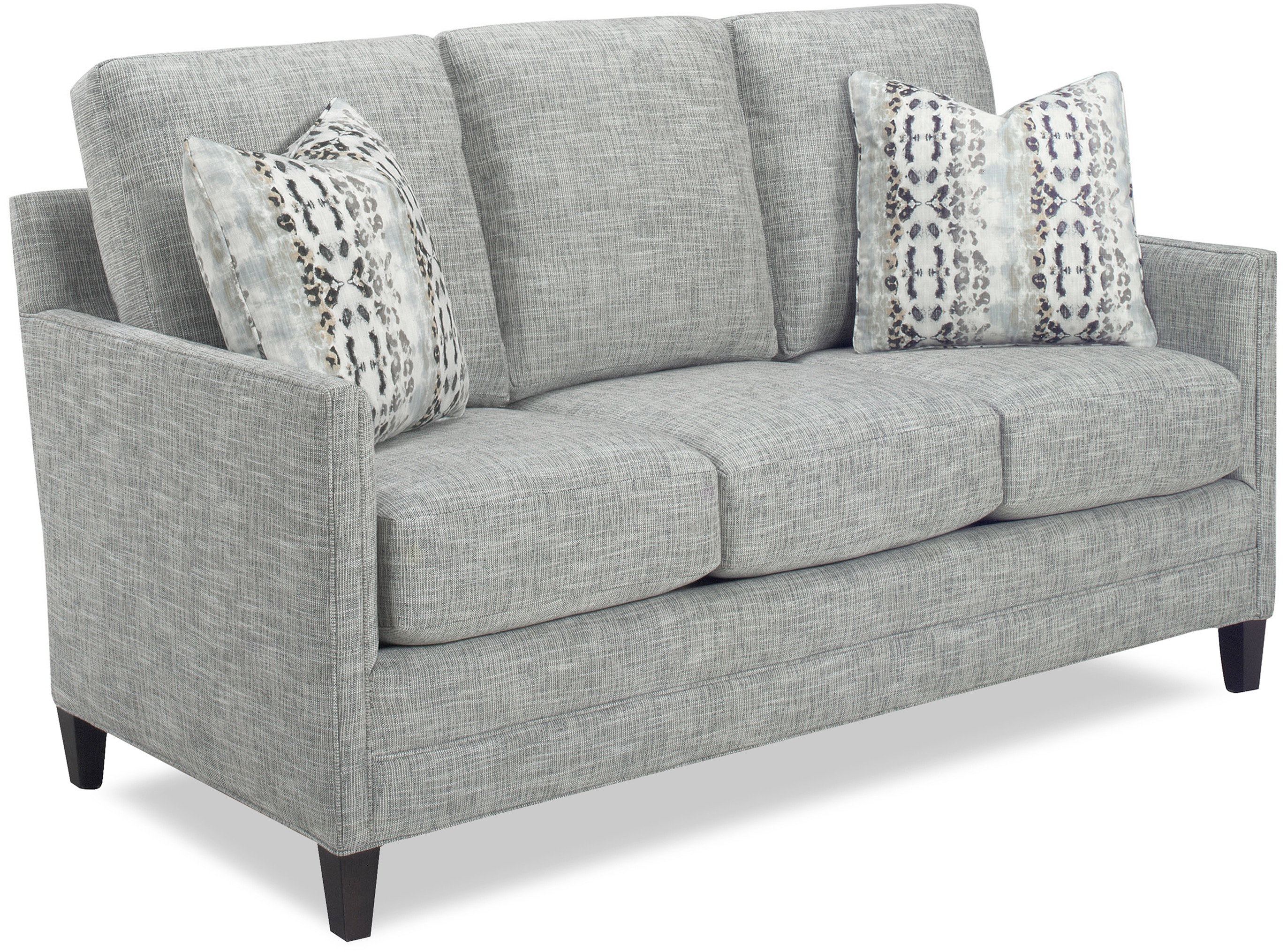 Founded on solid and manufactured wood frames, each sofa features a full back, track arms, and tapered block legs in a dark finish.